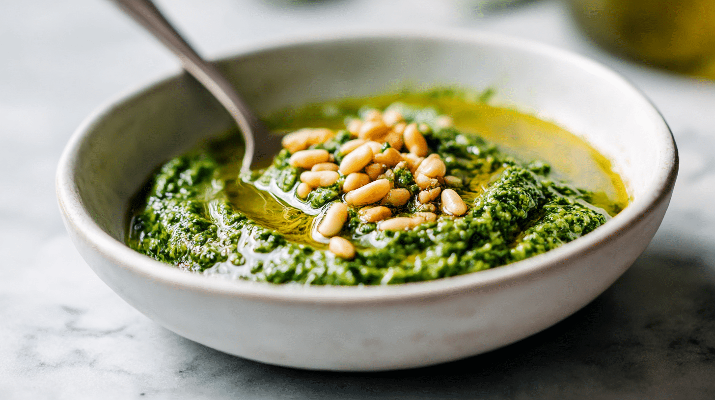 Fresh basil, quality olive oil, and minimal blending for texture—pulse, don’t puree, for his bold, chunky style suited to U.S. home blenders.