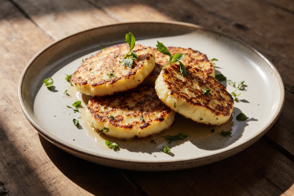 Stack the pancakes slightly overlapping. Garnish with fresh herbs. Opt for white plates to highlight that golden-brown color. A small dollop of yogurt or herb sauce on the side adds the finishing touch.